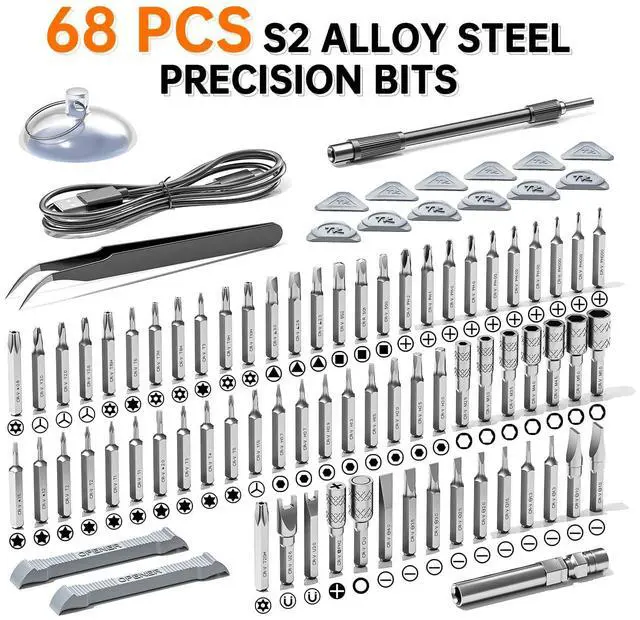 Main Features: 88 precision bits including Phillips, Pentalobe, Torx, Hex, JS, Slotted, Triangle, Square, and specialized bits Electric motor with 200 RPM max speed and 3.7V battery power LED light for illuminating work areas in dark spaces 5-speed torque settings for different application needs Magnetic handle with strong magnets for secure bit holding and screw pickup Color-coded system for easy bit identification and organization Ultra-hard aluminum alloy construction - half the weight of regular steel Perfect for Small Spaces & Travel: Absolutely! At just 1.5 pounds and compact dimensions (10.1 × 3.8 × 2.3 inches), it performs exceptionally well in tight spaces with organized storage case. Great for Everyone: Excellent for beginners to professionals - the electric motor reduces effort, 5 torque settings prevent over-tightening, LED lighting improves visibility, and ergonomic design makes it accessible for all skill levels including seniors. Key Advantages: Electric operation reduces hand fatigue during extended use Built-in LED provides better visibility than manual alternatives 5 torque settings prevent damage to delicate electronics Quick bit switching between long and short drill bits What's Included: Electric screwdriver handle, 88 precision bits, compact storage case with magnetic slots Minor Considerations: Battery-powered (requires charging), and the company has acknowledged past quality issues but redesigned products to address concerns.