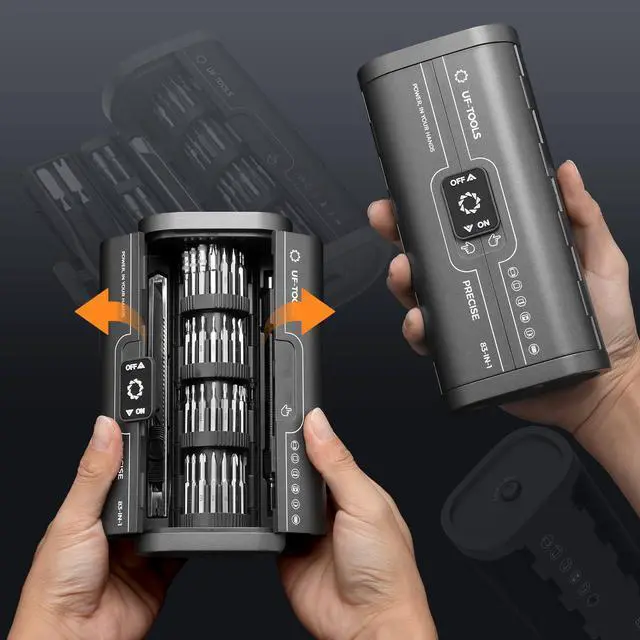The 83-in-1 Electric Precision Screwdriver Set delivers powerful torque up to 0.6 Nm with a 270 RPM motor, ensuring fast and precise repairs for smartphones, tablets, laptops, and more. Equipped with an 800mAh rechargeable battery and Type-C charging port, this cordless screwdriver offers long-lasting power and quick charging. Its rotating magnetic storage case keeps 72 premium S2 steel bits organized, while included long bits, pry tool, and tweezers handle various electronic devices with ease. The sleek aluminum alloy design combines durability with style. With an LED digital display for real-time torque and screw status, this digital display screwdriver set provides precision, control, and efficiency for every repair task.