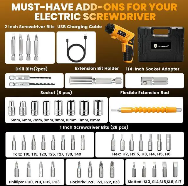 Versatile Accessories: This comprehensive screw driver set comes with all the accessories you need. It includes 29x 1-inch screwdriver bits, Drill 2x Bits 2x 2-inch drill bits, and 8x socket wrenches. The flexible extension rod allows this versatile cordless screwdriver to adapt to any scenario, making it an indispensable kit for your home, workshop, or job site.
