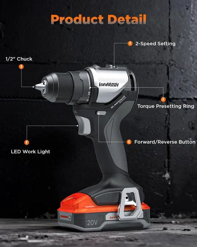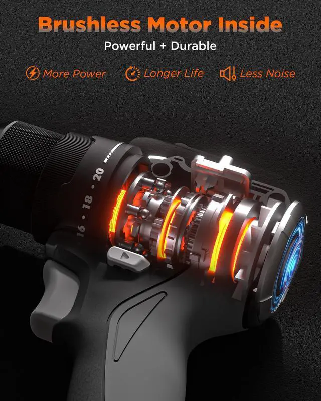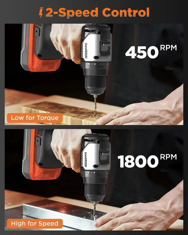 Two Speed Control: The drill driver offers 2 variable speed gears, 0-450 RPM for low-speed screwdriving and 0-1800 RPM for fast drilling. It's the ideal brushless drill for both DIY enthusiasts and professional use.