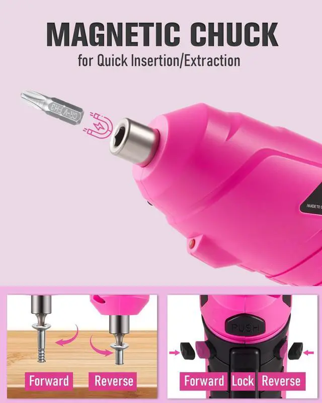 Pink Cordless Electric Screwdriver Set, 3.7V Rechargeable Small Electric Drill with 25pcs Driver Bit Set, Power 3Nm Screw Gun with 2 Position Handle, Flexible Shaft LED Light for Women