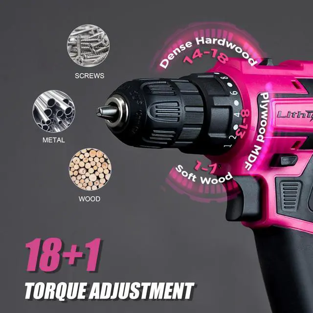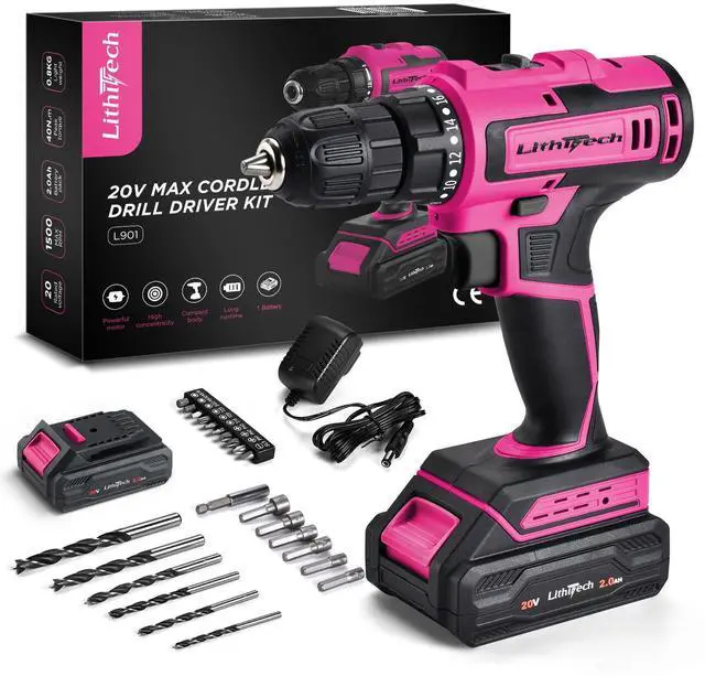 Lithitech 20V Pink Cordless Drill Set for Women - with 2.0A h Battery & Charger, 3/8" Keyless Chuck, Lightweight Electric Power Drill Tool, 2-Speed + 354 In-Lb Torque (Pink)