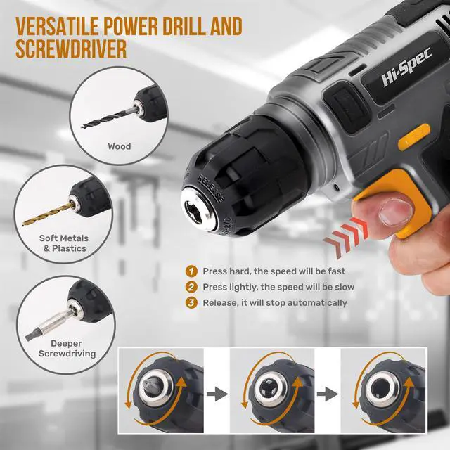 Easily swap drill and screw bits in-and-out with simple turning of the chuck-head. Perfect for woods, plastics, soft thin metals eg. aluminum and dry wall NB. NOT SUITED for brick, concrete, hardened metals or tiles