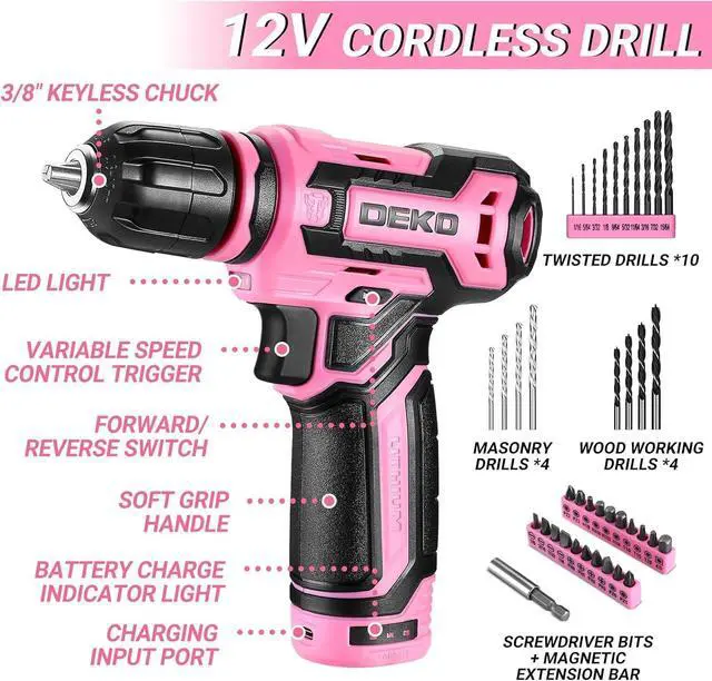 MULTI-FUNCTIONThe drill tool kit is a perfect pink tool set for women at home, tools and equipment for starter with diy projects, especially home essentials for house.The pink drill set is suitable for drilling holes in wood, metal, plastic boards, also it can be used for furniture assembly, repair or other small hand made for kids.