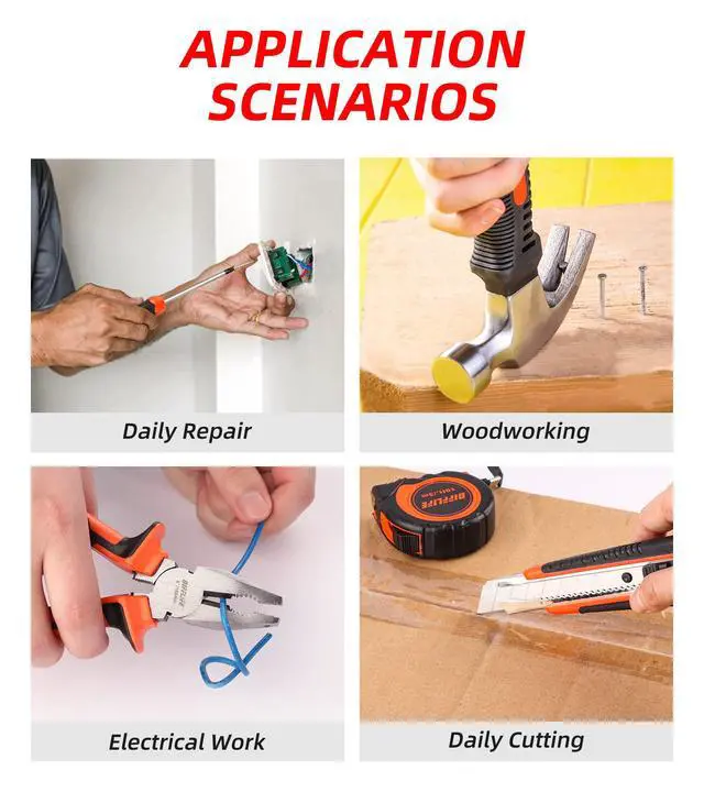 Claw hammer can be used for woodworking, combination pliers can be used for wire cutting, nail pulling, etc. Insulating tape can be used for bundling wires.