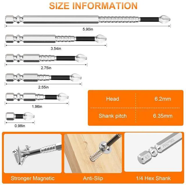 Electric PrecisionThe screwdriver bit set includes 2 sets six different sizes (25, 50, 65, 70, 90, 150mm) to accommodate a wide range of screws, making it suitable for electronics, furniture assembly, and more