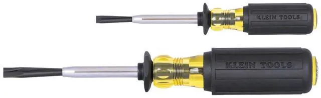 The Klein Tools 2-Piece Slotted Screw-Holding Screwdriver Set is designed with positive gripping action to hold, start and drive slotted screws in awkward, hard-to-reach places. The unique split-blade screw-holding driver can wedge into the screw slot. The exclusive Cushion-Grip handles offer greater torque and outstanding comfort.