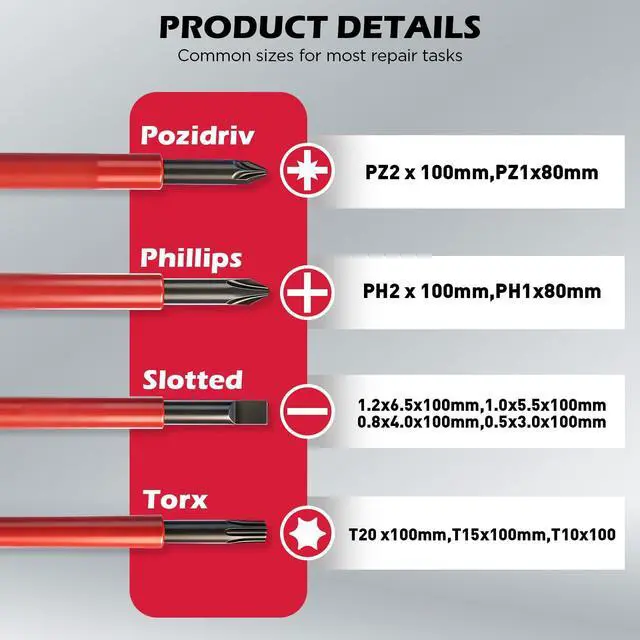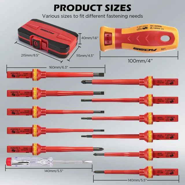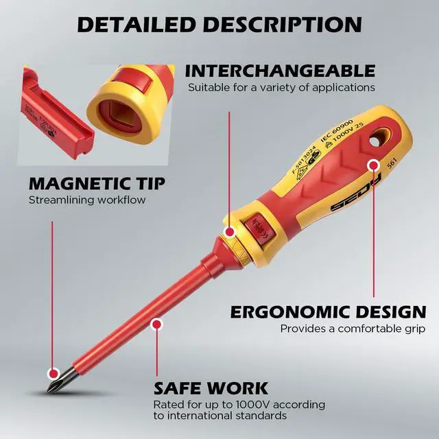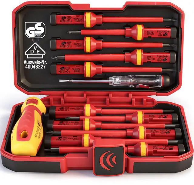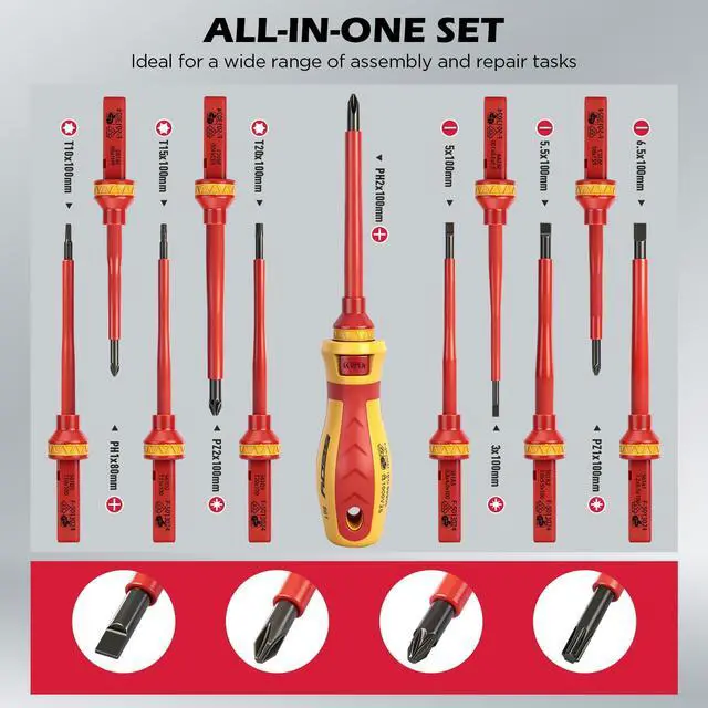 Experience unparalleled safety and precision with our 1000V screwdriver set, tailored for the discerning electrician. VDE and GS certified, each tool in this kit is crafted from robust Chrome Vanadium Steel, ensuring durability and performance. From Phillips to Pozidriv, Torx to Slotted, our comprehensive electrician insulated tool kit meets all your professional and DIY needs. Boasting user-friendly designs like a replaceable handle and magnetized tips, this set is your optimal choice for electrical tasks, automotive repairs, and household projects.