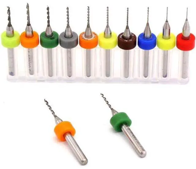 Set of 10 different size: 0.2mm,0.3mm,0.4mm,0.5mm, 0.6mm ,0.7mm ,0.8mm ,0.9mm,1.0mm,1.1mm,1.2mm PCB micro drill bits, each 1 pcs,multiple sizes included in one set to meet different needs.