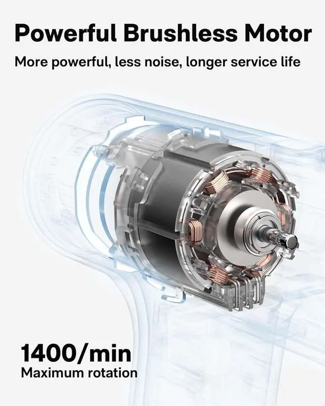 BRUSHLESS & 2000 MAH BATTERY: 2000 mAh rechargeable battery supports long battery life and can screw 550 screws after fully charged. Innovative built-in battery arrangement eliminates the need to carry bulky battery packs. Durable brushless motor, stable operation, no sparks, high-efficiency during operation, longer lifetime. This power drill is quiet in operation, giving you a quiet working environment. Speed up to 1400 RPM, can meet screw drive and drilling requirements in daily life.