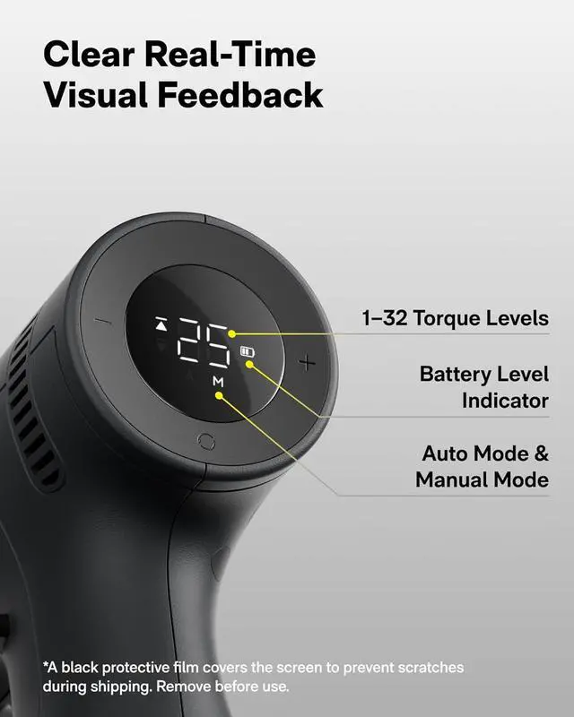 SMART DIGITAL DISPLAY: Clear LED screen shows real-time torque settings, battery status, and operating modes with 32 precise torque levels for every task