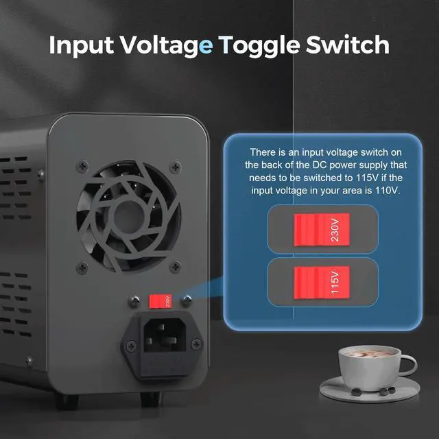 In order to facilitate widespread use by customers in different regions, our DC adjustable power supply adopts a dual input voltage function, with an input voltage selection of 230V/115V. If you are in an area with an input voltage of 110V, you will need to flip the switch to 115V. Choosing the wrong option will affect the user experience of the DC power supply.