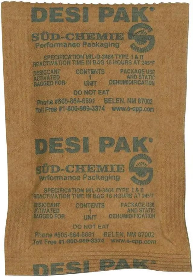 3 x 4 x 1/4" Kraft Clay Desiccants - 5 Gallon Pail. Ultimate moisture and corrosion protection for shipments! Use to protect products vulnerable to moisture damage during storage and transport. Ideal for protecting pharmaceuticals, nutraceuticals, diagnostics, electronics and food. Bags are strong, durable and allow for extremely high adsorption rates. Activated clay desiccant filling is a free flowing granular material with high moisture adsorbing ability from 20-80% relative humidity under normal packaging and storage conditions. Meets FDA specifications for direct contact with food and drugs. Protects 0. 83 Cubic Feet.