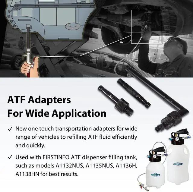 1. Connects to FIRSTINFO part no. A1132NUS, A1135NUS ATF Filling Dispenser Tank. 2. Suitable to Subaru, for Nissan, for VW, for Passat & Tiguan after 2007. 3. Thread: M12x1.25, M10x1.25, 90°-M10x1 4. Black finish and knurled handle.