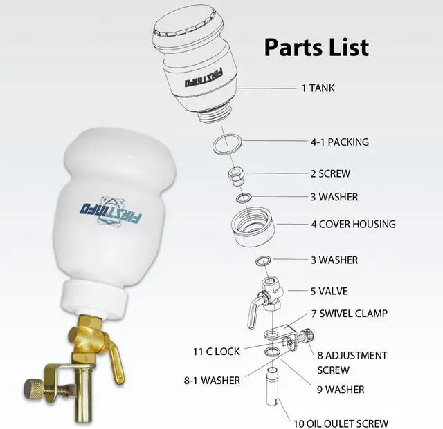 4. The refilling bottle with an adjustable swivel clamp provides stability for filling.