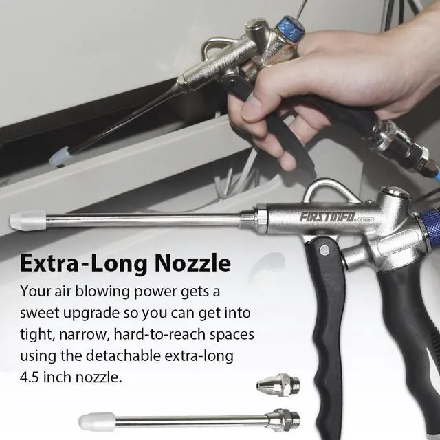 **Convenient to blow dust, stubborn debris, water, and more off of all kinds of materials, machinery, and engine compartments, etc. with FIRSTINFO powerful air blow gun with 150 maximum PSI.
