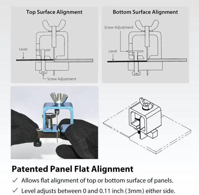 4. Level adjustment allows flat alignment of top or bottom surface of panels.