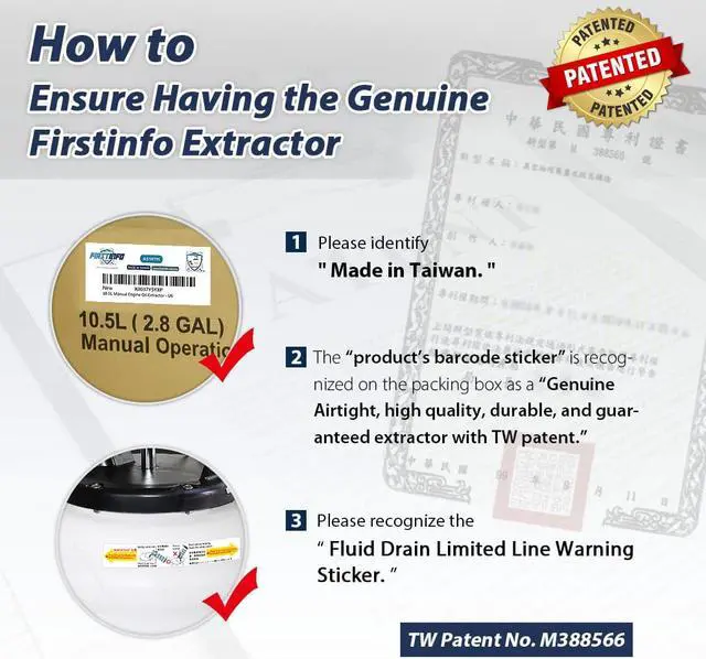 Genuine Guarantee Please identify FIRSTINFO fluid extractor with patent authentication(TW