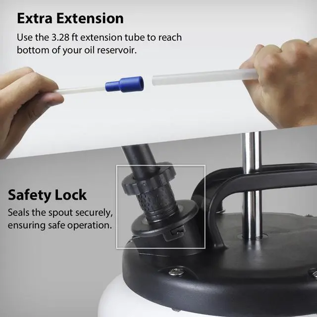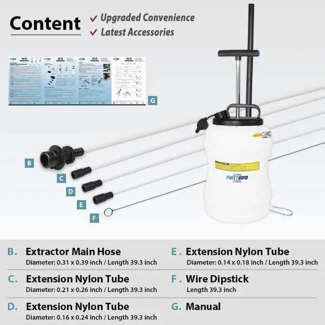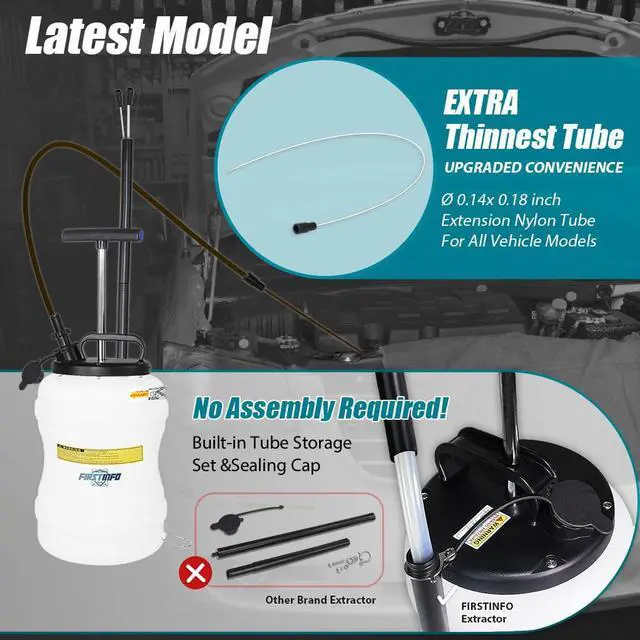 No Oil Left Come with an Extra Ø 3.5 x 4.5 mm Thinnest Tube to extract oil through the dipstick funnel and reach the bottom of the oil pan to suck up the last drop of fluid. *Note: Gasoline and fluid with high volatility, high corrosion, high alkalinity or acidity, and high temperature are FORBIDDEN to be in the extractor.