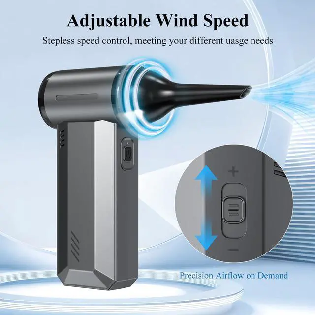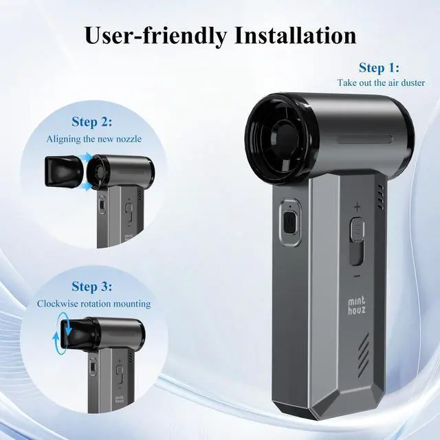 Hold the electric air duster mouthpiece firmly and press down to remove. Align the new nozzle with the connector and push inward until securely attached. Always check the mouthpiece is properly installed before use.