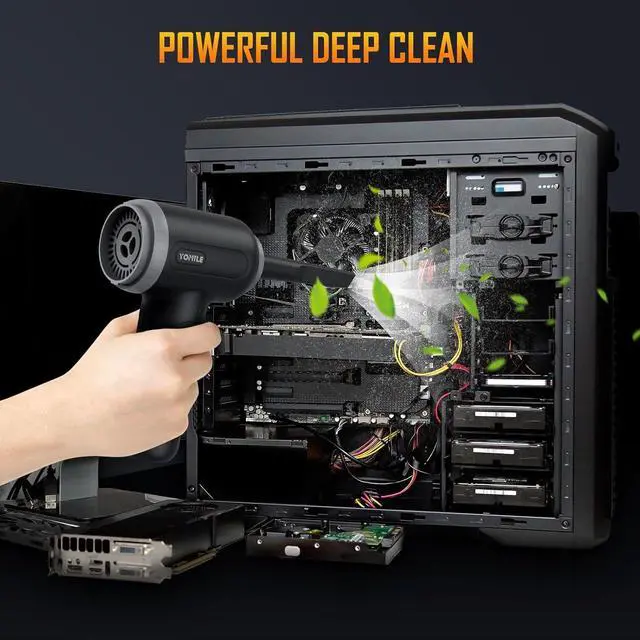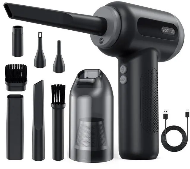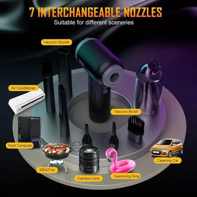 2-in-1 Air DusterThis air blower & mini car vacuum has a dual mode of blowing and sucking. It can not only blow away trash and dust from computer keyboards, cars, etc., but also as a mini vacuum cleaner to clean up residual trash or hair from desk,floors,hair etc. Making it a great buy for your cleaning needs, let you no longer worry about cleaning.