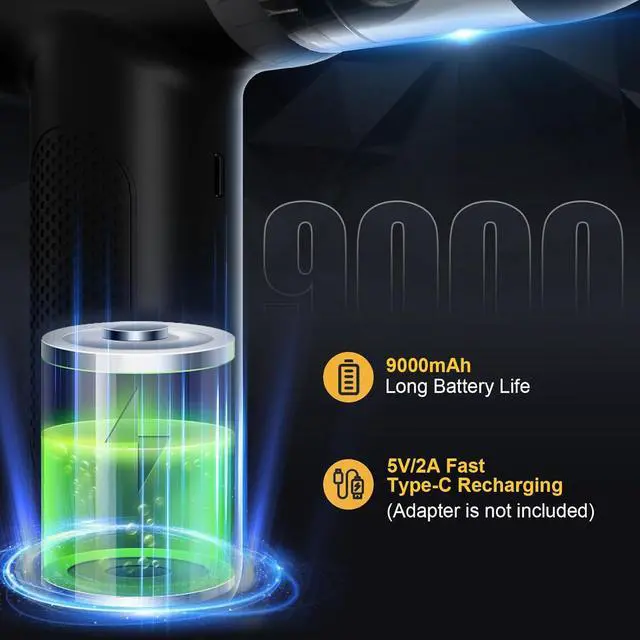 Long Lasting and Fast ChargingThe eletric air duster has a built-in 9000mAh battery, which can run continuously for up to 40 minutes. Comes with USB-C fast charging cable, fully charged within 3-4 hours (Adapter is not included, can be charged by any usb charger).