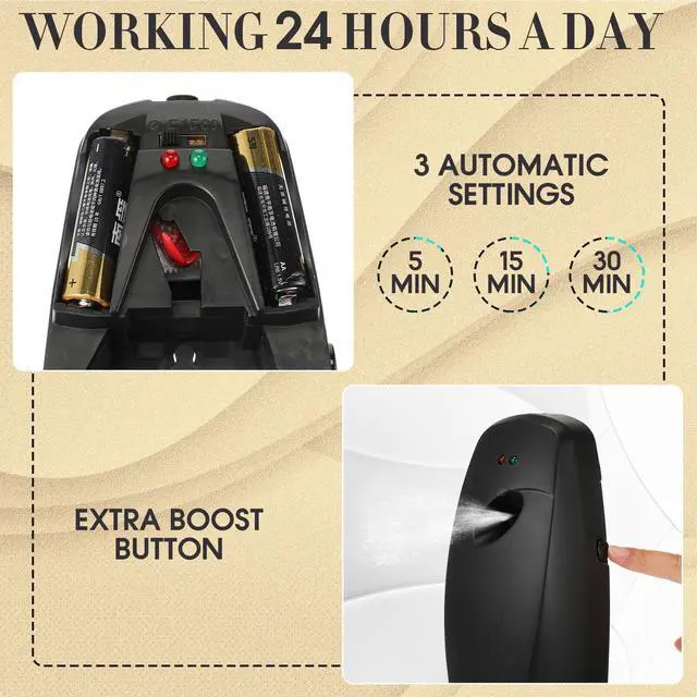 Adjustable Time/scent Release Setting: this automatic scent dispenser offers an adjustable time setting with options for intervals of 5/15/30 minutes; Equipped with a light sensor to determine day and night, the diffuser also offers a button on the side of the sprayer that releases additional freshness when needed; Battery powered, it can emit fresh fragrances for an extended period; Please note that the battery is not included in the package