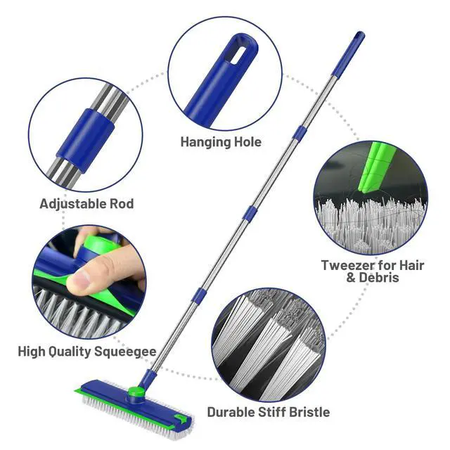 Multifunctional 3-in-1 Floor Scrub Brush: Equipped with a stiff-bristle brush, rubber squeegee, and tweezers. It scrubs stubborn stains and scrapes dirty water effortlessly