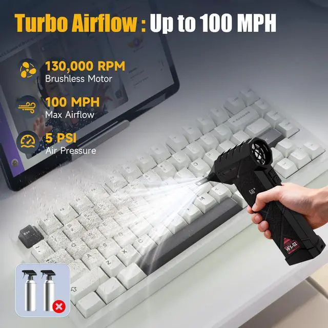 High-Speed Brushless Motor with Strong Airflow: Powered by a 130,000 RPM brushless motor delivering up to 45 m/s (100 MPH) high-speed airflow, this duster removes dust from keyboards, PC cases, heat sinks, vents, and deep crevices efficiently and powerfully.