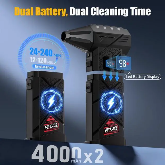 Dual Batteries with Long Runtime: Built with 2×4000mAh high-capacity batteries, providing 8000mAh total and 24240 minutes runtime depending on speed level. Ideal for extended PC cleaning sessions, car detailing, and outdoor tasks.