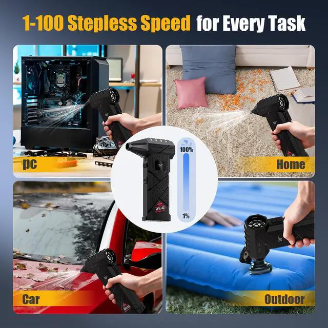 100-Level Stepless Speed Control: Adjust airflow precisely with 100 smooth speed levels from gentle cleaning for keyboards and electronics to turbo airflow for heavy-duty dust removal, outdoor blowing, and multipurpose use.