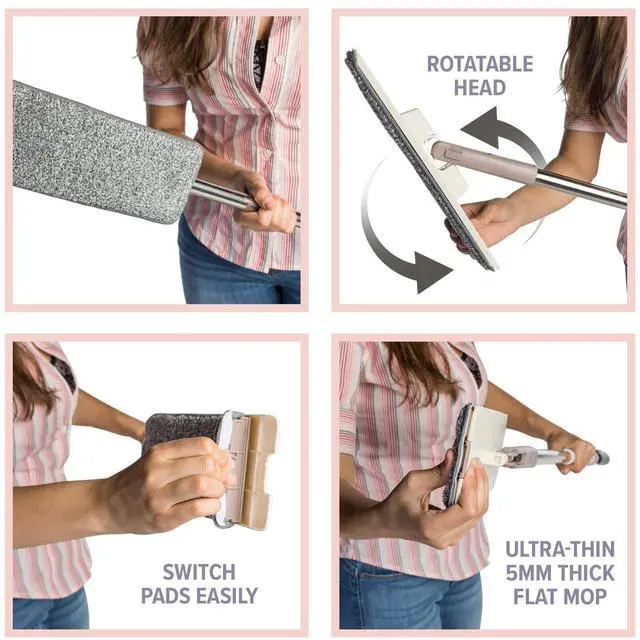 Make cleaning as painless as possible. The microfiber pads are measured at 5 mm thick, combined with a 360-degree swivel handle, and 180-degree swivel mop head, the Micro Flat Mop is perfect for hard-to-reach areas, such as under fridges, dressers, nightstands, or cabinets that other products may miss.