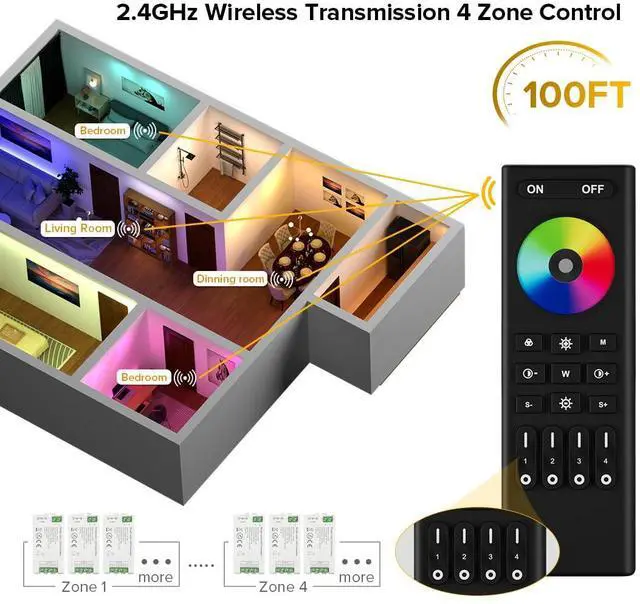 • Group Control4-zone group control separately, no device limits.Each remote can match and control one or more controller.Auto transmitting and synchronization the signal,Independent control of individual areas.As long as the distance between the controllers is no more than 98 feet in open environment, you can control the controllers in 4 different areas.You can also purchase multiple of our controllers separately.