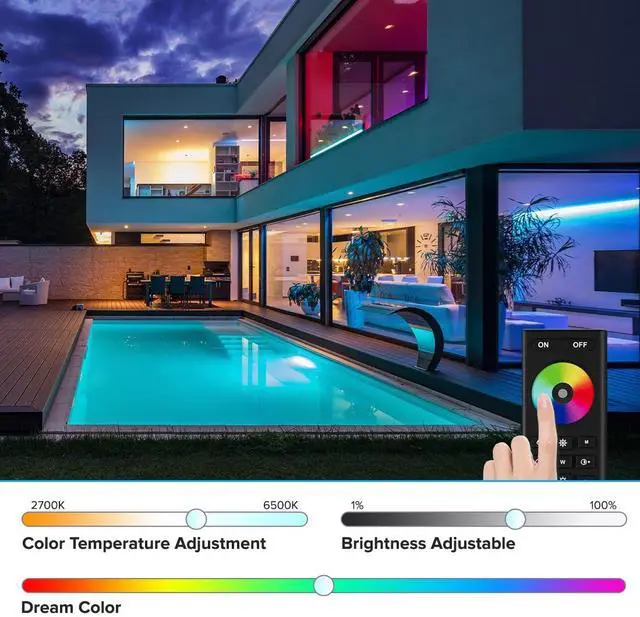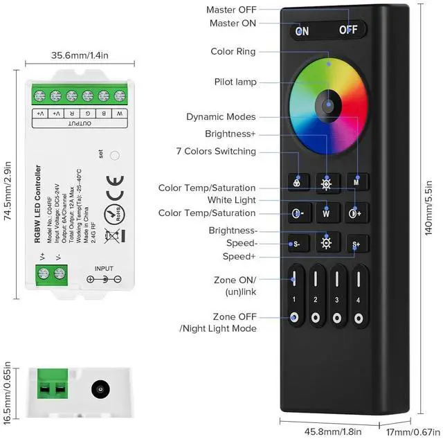 • Brightness and Color adjustingYou can adjust the brightness and light color according to your different use requirements.RGB+White, 16 million colors to choose.New black appearance of the remote control.Comfortable hand feeling.