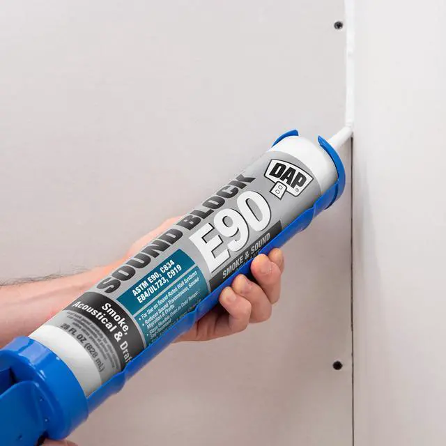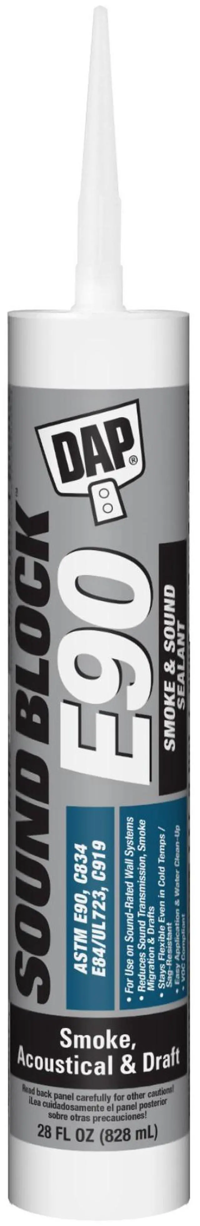 DAP E90 SOUND BLOCK Acoustical, Draft, Smoke & Sound Sealant is a professional-grade, acoustical latex sealant specifically designed to reduce sound transmission & improve STC ratings in all types of wall & floor systems where a sound rated assembly is required. It is ideal for sealing openings around electrical boxes, pipes, duct systems, cut-outs and other types of utility equipment penetrating wall surfaces, as well as perimeter edges including abutting surfaces and corner joints. Country of Origin: United States.