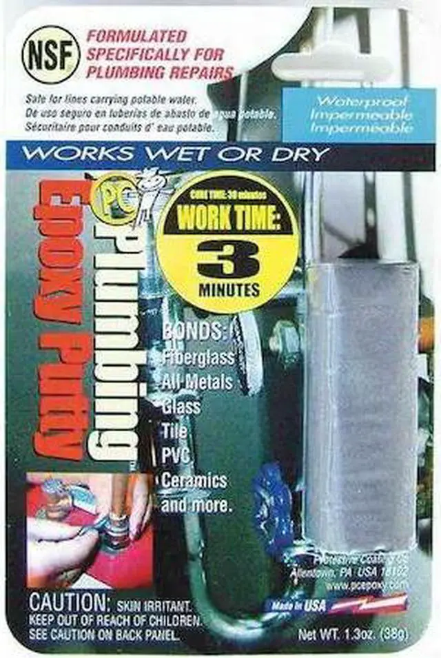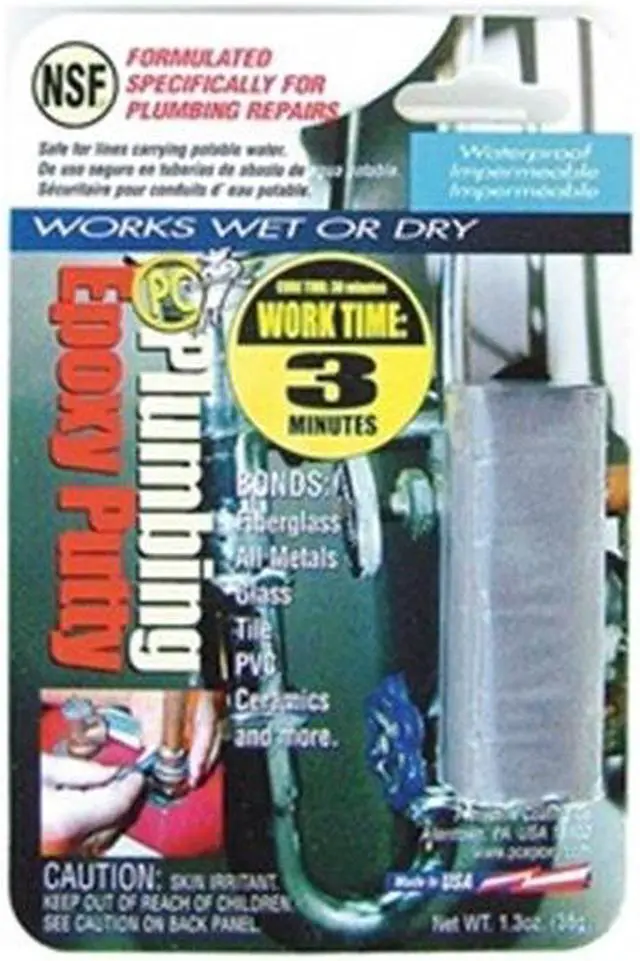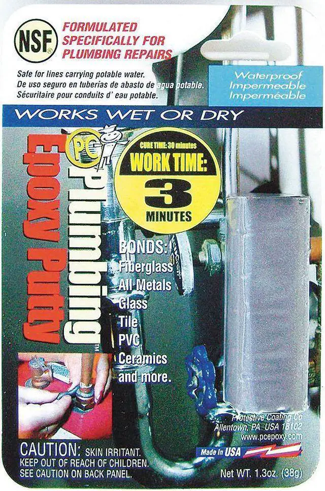 PC-Plumbing Cures Wet or Dry— Bonds: Fiberglass, All metals, Glass, Tile, PVC, Ceramics and just about any other surface. NSF rated safe for potable water contact. Suitable for Interior and Exterior applications. After 60 minutes the application can be sawed, sanded, tapped, drilled, machined, filed, and painted. The consistency eliminates drips and runs, promotes adhesion to the surface, and allows the material to be shaped and formed as needed before curing begins.. This item has been restricted from sale in the following state(s): []