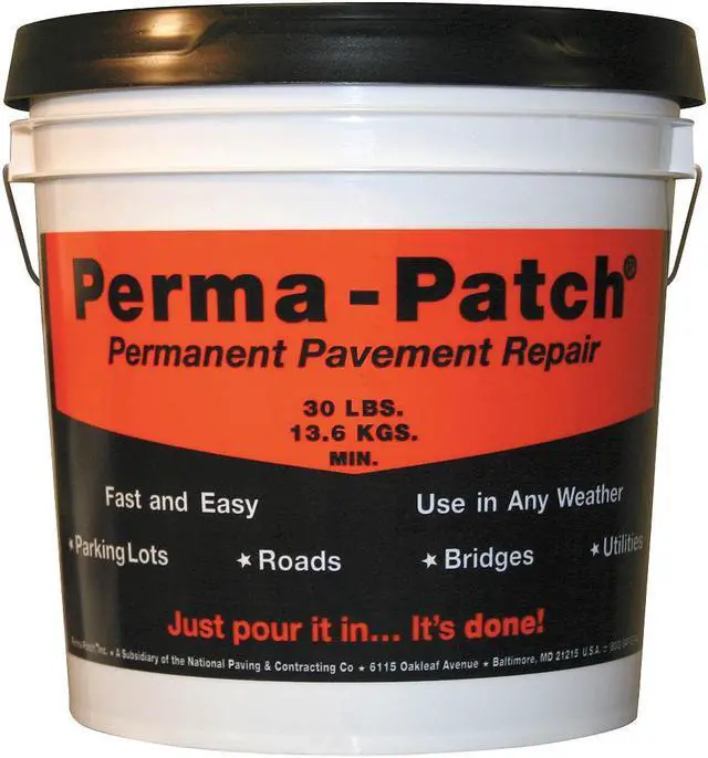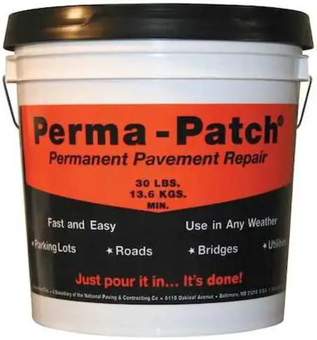 Patching Application Mortars and Patching Cements, Permanent Pavement Repair, Color Black, Container Size 30 lb, Container Style Pail, Coverage 3 sq ft @ 1 in, VOC 0 g/L, Flash Point 250 Degrees F, Application Temp. Range 0 Degrees to 105 Degrees F, Starts to Harden 1 min, Full Cure Time 1 min, For Use On Surface Material Asphalt, Concrete, Steel, Wood, Application May Be Used In Any Temperature Or Weather Condition, Pour Directly From The Bag, For Use With Asphalt or Concrete Pavement.