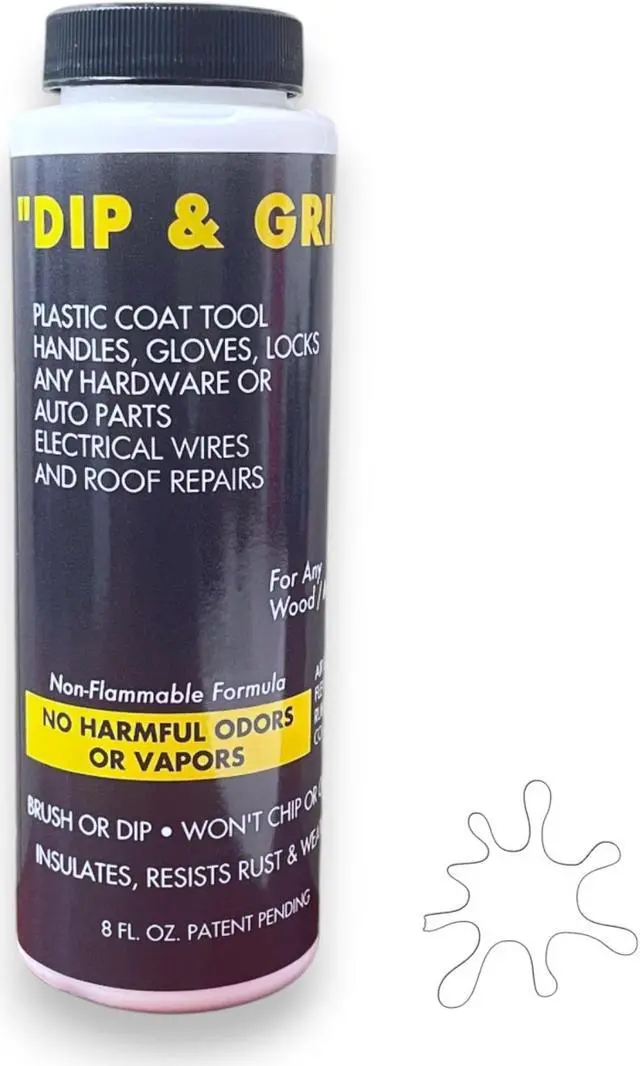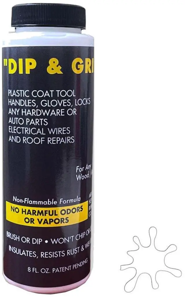 Liquid Leather Dip and Grip rubberized plastic coating on tool handle wires gloves is the perfect coating for all hand tool grips Plastic coat tool handles gloves locks and hardware or auto parts dip and grip is as simple as it sounds. Just dip the handle of any hand tool in dip and grip and it applies a rubberized plastic coating. Brush or dip won't chip or crack. Dip and grip can also be used to repair broken wires coat battery cables and identify machinery. Hundreds of other uses around the home and for your vehicles.