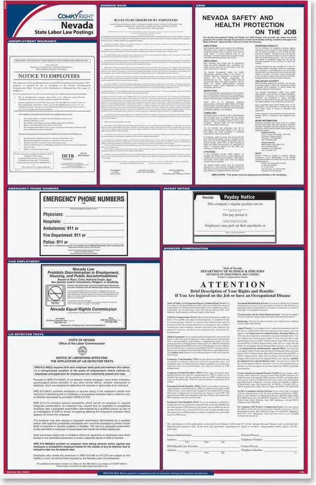 ComplyRight Nevada Labor Law Posters. These posters are current with the most recent federal/state posting changes. Information is consolidated and printed in an easy-to-read format for maximum space efficiency. Poster is fully compliant to ensure strict adherence to size, type font and layout requirements. It is laminated for added durability.