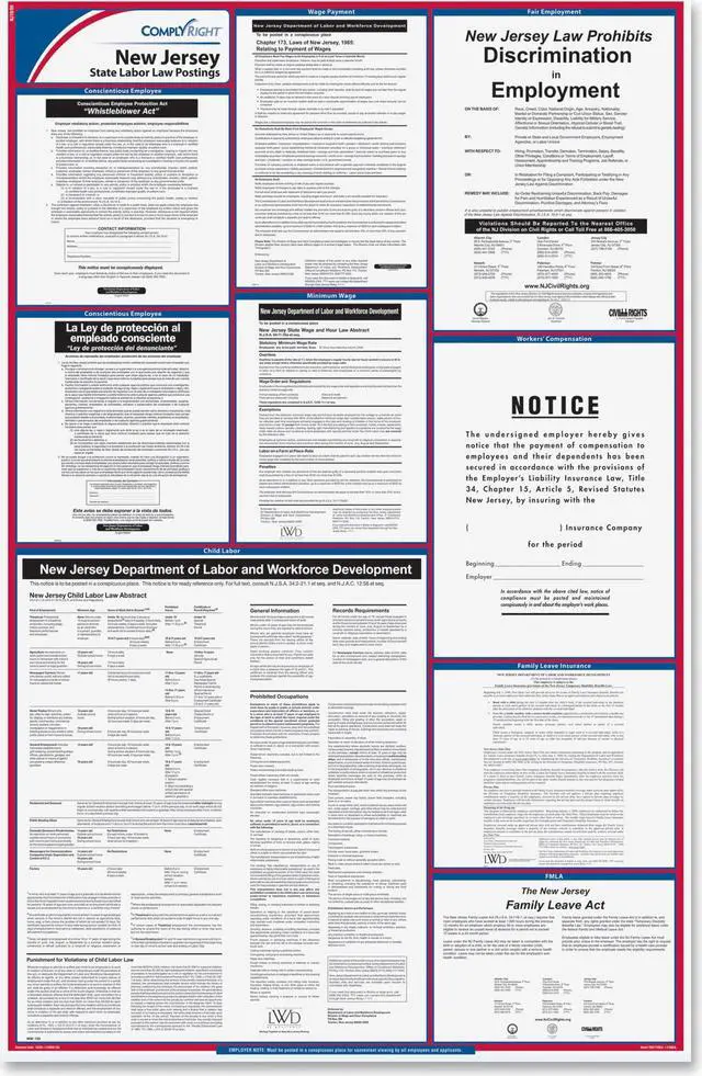 ComplyRight New Jersey Labor Law Posters. These posters are current with the most recent federal/state posting changes. Information is consolidated and printed in an easy-to-read format for maximum space efficiency. Poster is fully compliant to ensure strict adherence to size, type font and layout requirements. It is laminated for added durability.