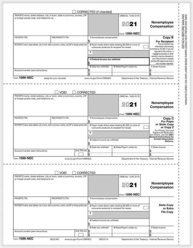 2024 1099 NEC Recipient Copy B, Payer/State Copy C & State/Extra file copy laser cut forms. This 1099-MISC form allows you to report miscellaneous payments, and non-employee compensation. 8.5" x 11", Printed in Black ink, 1 sided. (100 sheets per Pack)
