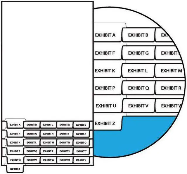 Collated Legal Index Divider Sets, Letters Exhibit A-Z Letter Size Bottom Tab, 1/5th Cut, 26 Tabs per Set feature a Side tab that extends 1/2" from the main body of the sheet. Legal Index Dividers have a 1/2" shoulder, which allows the 2" Mylar coating to extend beyond the tab length, making the tab more durable. Letter sized sheets measure 8-1/2" x 11". Each 1/5th cut Bottom tab is 1-1/2" long, and come 26 Collated tabs per set. Each box contains 10 sets of Collated tabs.