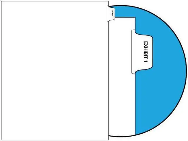 Legal Index Divider Sets, Number Exhibit 1 Letter Size Side Tab, 1/10th Cut, 25 Tabs per Set feature a Side tab that extends 1/2" from the main body of the sheet. Legal Index Dividers have a 1/2" shoulder, which allows the 1-1/2" Mylar coating to extend beyond the tab length, making the tab more durable. Letter sized sheets measure 8-1/2" x 11". Each 1/10th cut Side tab is 1" long, and come 25 tabs per set. Each box contains 10 sets of tabs.