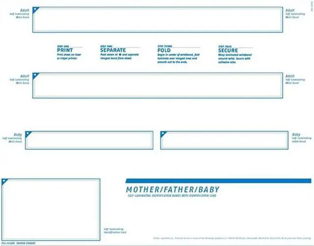 These PLS-105AT sheets help streamline identification for labor and delivery and other infant units by combining two, 8-3/8" x 3/4" adult wristbands; two, 4-1/4" x 1/2" infant wristbands; and one, 3-1/4" x 2" ID card all on a single form