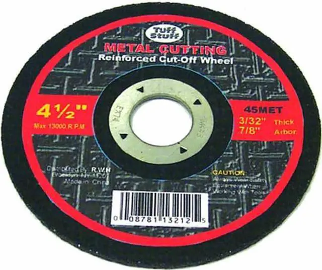 Tuff Stuff, 45MET, 4-1/2" X 3/32" X 7/8" Arbor Metal Cutting Blade, Applications Include Cutting All Types Of Ferrous Metals, Steel, Rebar, Tubing, Studding & Decking, Max RPM Rating 13, 000.