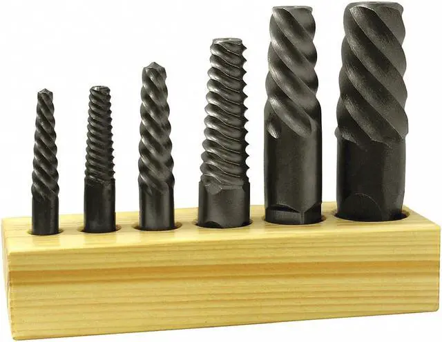 Screw Extractor Set, Extractor Type Spiral Flute Screw Extractor, Number of Pieces 6, Drill Size 1-1/16 in, 13/16 in, 17/64 in, 23/64 in, 31/64 in, 39/64 in, For Bolt Size 1-1/8 in to 1-1/2 in, 1-3/4 in to 2-1/8 in, 1-3/8 in to 1-3/4 in, 11/16 in to 15/16 in, 15/16 in to 1-1/8 in, 9/16 in to 3/4 in, Material - Machining High Speed Steel, Overall Length 3-3/4 in, 3-3/8 in, 4-1/8 in, 4-3/8 in, 4-5/8 in, Container Type Wood Block, Drive Type Square
