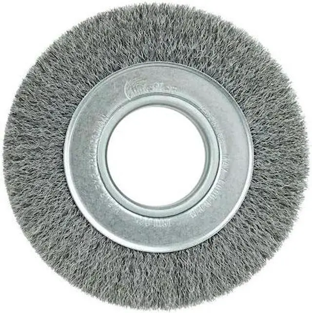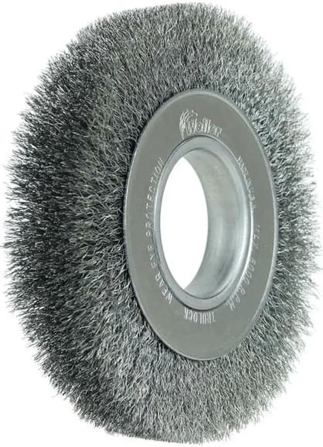 Weiler Wheel Brush, Medium Face, 6 in Brush Dia, 1 in Face Width, 2 in Arbor Hole Size, Crimped Filament/Wire Type, 0.008 in Filament/Wire Diameter, Steel Fill, 1-1/8 in Trim Length, 6000 rpm Maximum, Unthreaded Arbor Attachment. Provides a flexible brushing action and consistent performance for demanding light-duty cleaning and deburring applications on steel, armored steel, cast iron, ductile iron and tool steel parts. Featuring Weiler's solid ring construction, these radial brushes are available in heat-treated steel, type 302 stainless steel and brass wire.