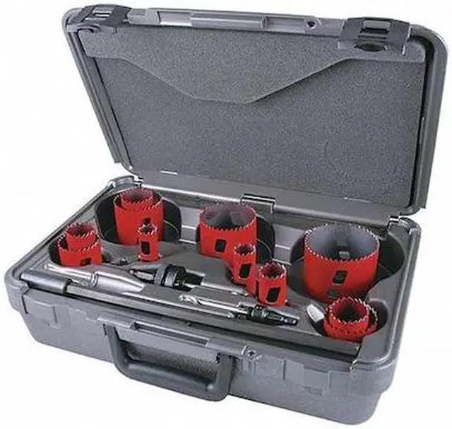 Hole Saw Kit, Primary Material Application General Purpose, Materials Cut Duct, Mild Steel, Nail-Embedded Wood, Non-ferrous Metals, Pipe, Plastic, Stainless Steel, Tube, Arbor Design Built-In Arbor, Tooth Material Bi-Metal, Teeth per Inch 5/6, Max. Cutting Depth 1 7/8 in, Impact Rated Not Impact Rated, Number of Hole Saws 11, Saw Size Range 3/4 in to 3 in, Hole Saw Sizes (Hole Saws) 3/4 in, 7/8 in, 1 in, 1 1/4 in, 1 3/8 in, 1 1/2 in, 1 3/4 in, 2 in, 2 1/4 in, 2 1/2 in, 3 in.