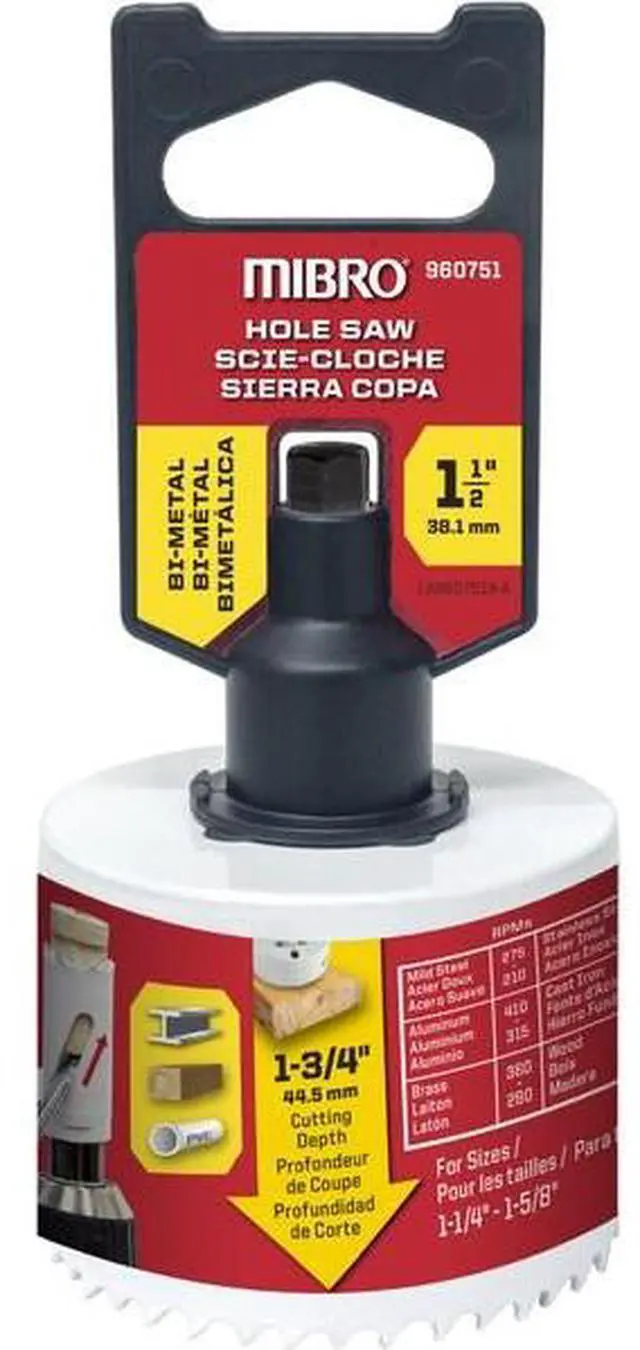 California Proposition 65: This product contains a chemical known to the State of California to cause birth defects or other reproductive harm. MIBRO's bi-metal hole saws are manufactured with a heavy-duty backing plate for superior rigidity. M3 high-speed steel heat-treated teeth are electron beam welded to the blade body for strength and consistent blade hardness. 4/6 variable tooth pitch gives efficient and safe cutting of metal, plastic, and wood. EZE Slot is designed for quick and easy plug removal on all blades with a diameter of 1 3/4 in (45 mm) and larger. Hole saw includes screw in mandrel and pilot drill.