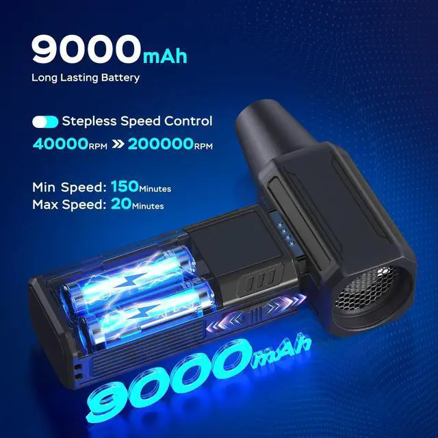 Stepless Speed ControlThis air blower features stepless speed control, allowing you to adjust the airflow seamlessly from a minimum of 40,000 RPM to a maximum of 200,000 RPM.Unlike models with only 2 or 3 fixed speeds,our dust blower feature provides precise control over the airflow to match various cleaning tasks, making it versatile for a wide range of applications.